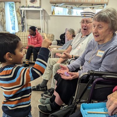 During our Mix and Mingle time we get out more toys to play with and the Care Home usually provides juice and biscuits for everyone. This is a great time to get to know one another or just play games together. There will also be an opportunity to do a simple themed craft. These are provided on trays and we encourage residents and children to work together but as always, only if they are comfortable to do so.